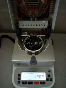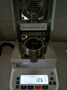 • 測試種子顆粒1:為了使測試過程中種子水分儀將種子烘干烘透,我們將種子分散開來,以便溫度能滲透進種子內(nèi)部。取5克種子顆粒撒于不銹鋼托盤中,用鑷子將種子顆粒平鋪均勻,為避免種子烘烤后變焦,我們將溫度設(shè)置在135℃,按“START”鍵開始測試,18分49秒后檢測結(jié)束,檢測數(shù)據(jù)顯示12.61%;