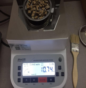 再次測試同樣撕取2克紙皮均勻平鋪在托盤中,5分鐘左右檢測結(jié)束結(jié)果顯示10.74%。