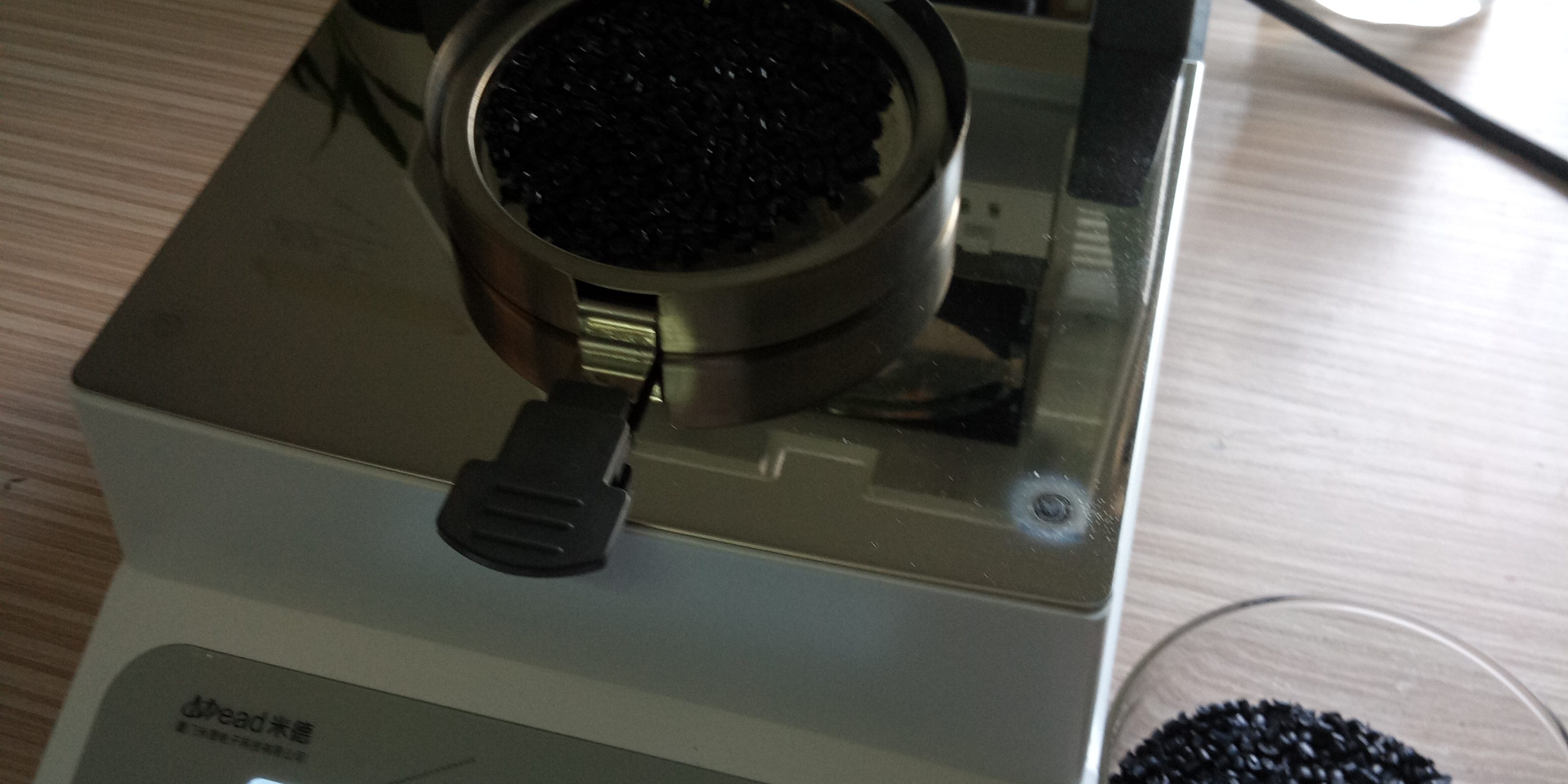 • 測試再生尼龍顆粒:倒出8克左右再生尼龍料顆粒倒在不銹鋼托盤中,為了使測試過程中再生尼龍水分儀將再生尼龍料烘干烘透,我們將尼龍顆粒攤成分散狀,以便溫度能滲透進再生尼龍內(nèi)部。用鑷子將再生尼龍顆粒平鋪均勻,為避免尼龍顆粒烘烤后變焦變黑,我們將溫度設(shè)置在125℃,按“START”鍵開始測試,5分40秒后檢測結(jié)束,檢測數(shù)據(jù)顯示0.67%;