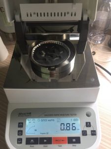 3、平衡后將樣品瓶移出,取出樣品,用電子天平稱取樣品置于樣品瓶內(nèi),然后在水分儀上點擊開始測量,同時將樣品瓶裝入加熱槽。