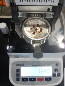 用鑷子提取2.2克牛肉肉末,置于不銹鋼托盤中,用鑷子將牛肉肉末平鋪均勻,溫度設(shè)置145℃用儀器進(jìn)行加熱,檢測結(jié)束,檢測數(shù)據(jù)顯示71.16%;為了檢測儀器的精確性,待儀器溫度降至50℃以下時(shí)進(jìn)行第二次測量,用實(shí)驗(yàn)勺提取2.2克牛肉,置于不銹鋼托盤中,用實(shí)驗(yàn)勺將面粉平鋪均勻,溫度設(shè)置150℃用儀器進(jìn)行加熱,檢測結(jié)束,檢測數(shù)據(jù)顯示71.85%;
