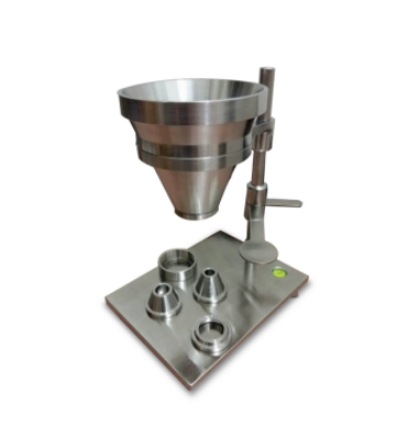 2.漏斗上口徑為:110mm;出口孔徑分別為:10±0.05mm,高度為:140mm;15±0.05mm, 高度為:133mm;25±0.05mm,高度為:120mm三種規(guī)格,角度40度;;依據(jù)標(biāo)準(zhǔn)要求如果測(cè)試的試料流動(dòng)性比較差,不能完全流動(dòng)或者根本流不動(dòng)時(shí),因更換更到口徑的漏斗試驗(yàn),并在試驗(yàn)報(bào)告中注明。
